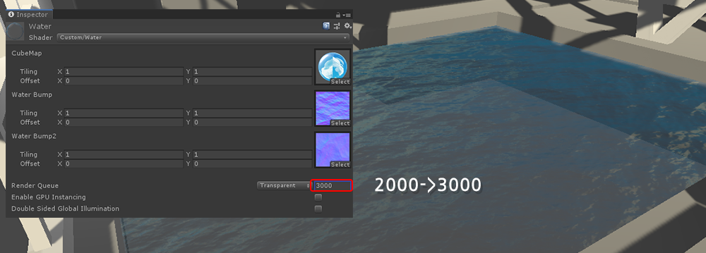 일단은 물 머티리얼로 가서 렌더큐 값을 수정해준다.