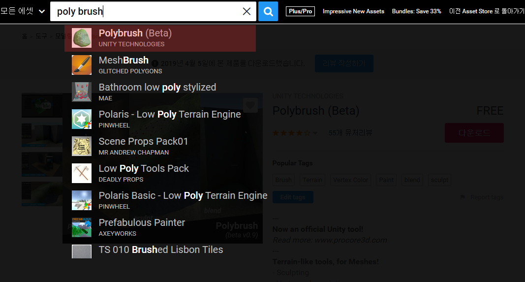 에셋에서 다운로드하여서 사용해야 한다. 에셋 스토어에서 PolyBrush를 검색하면